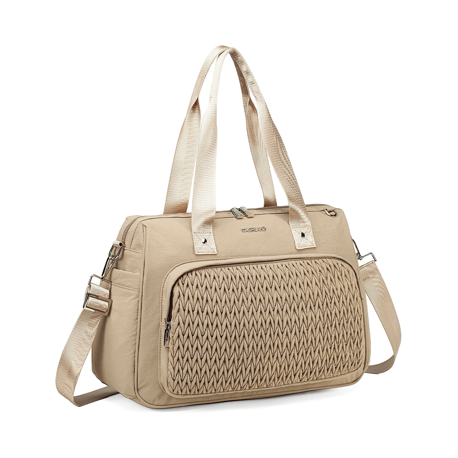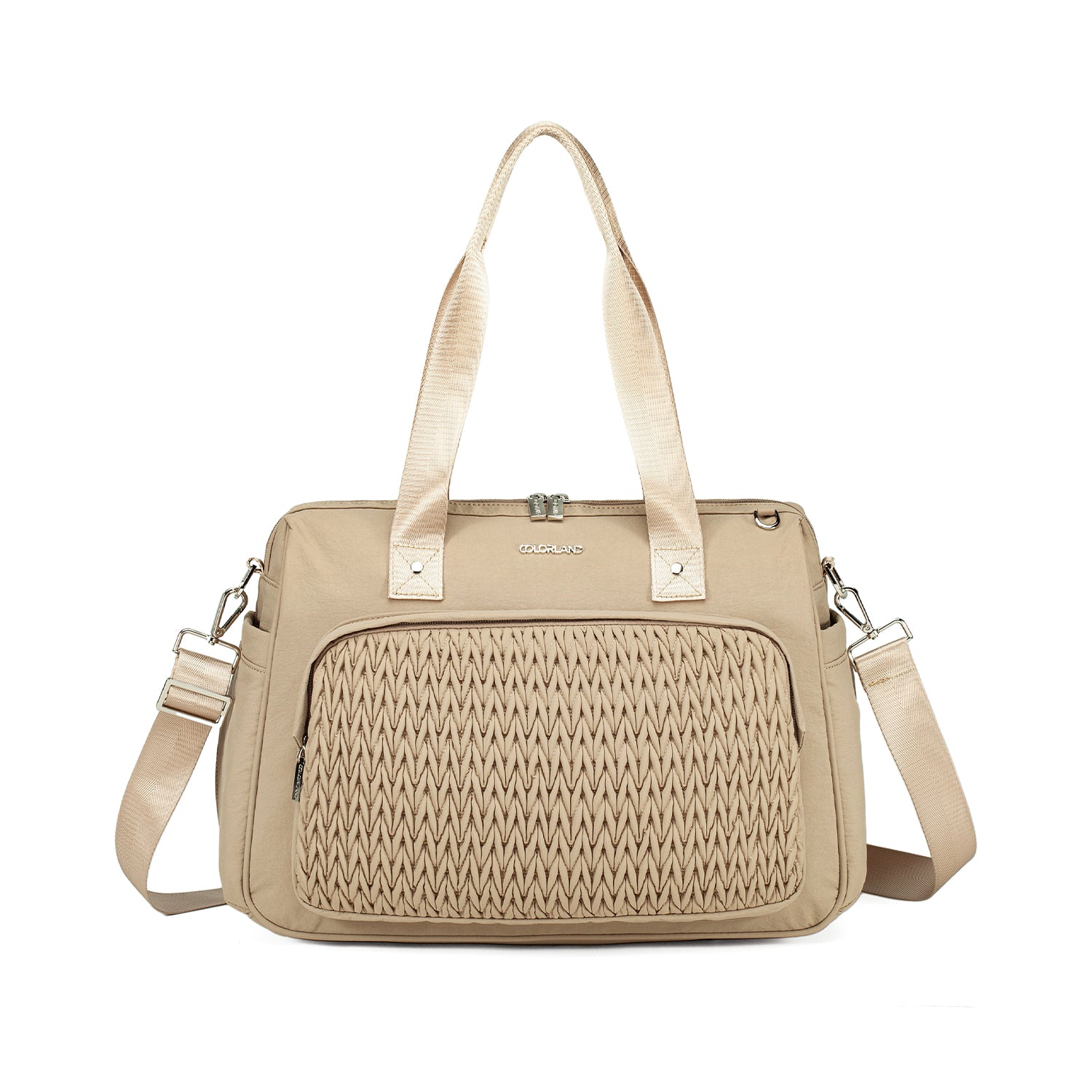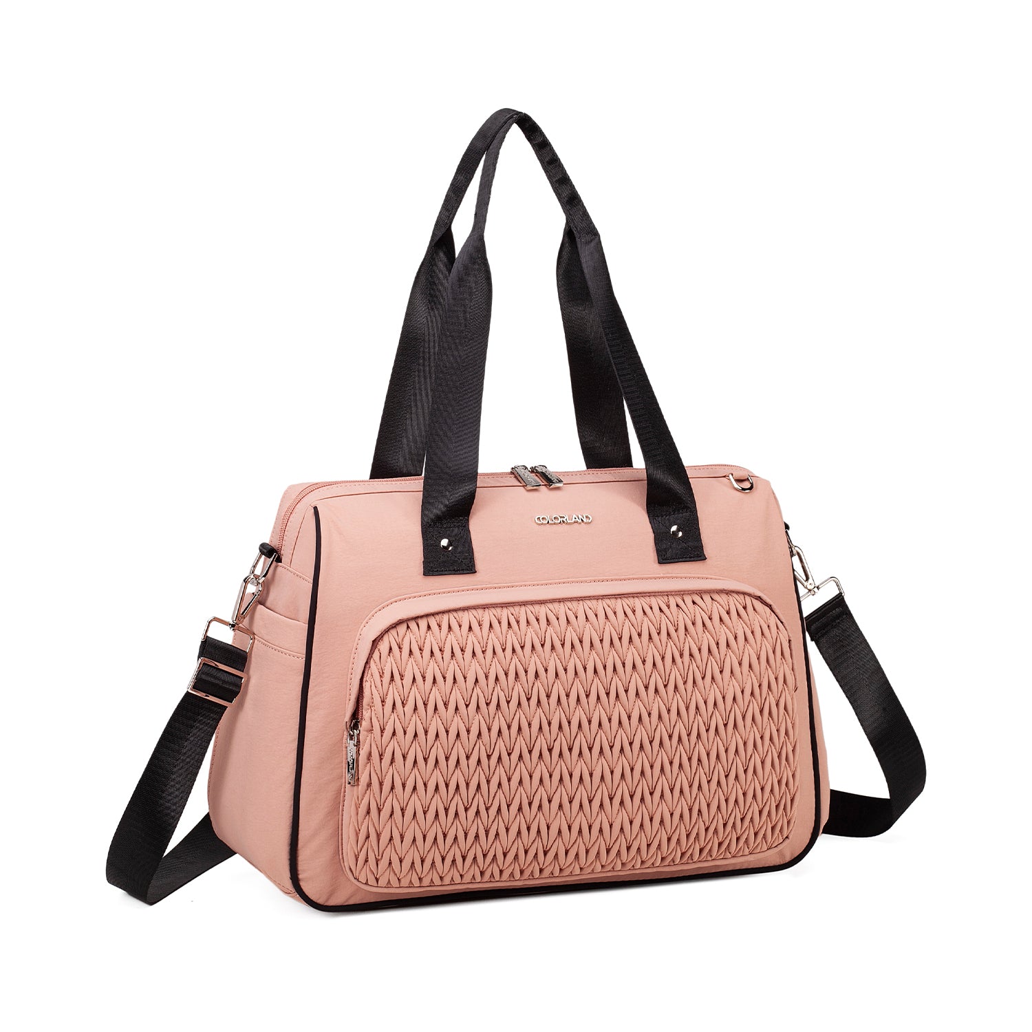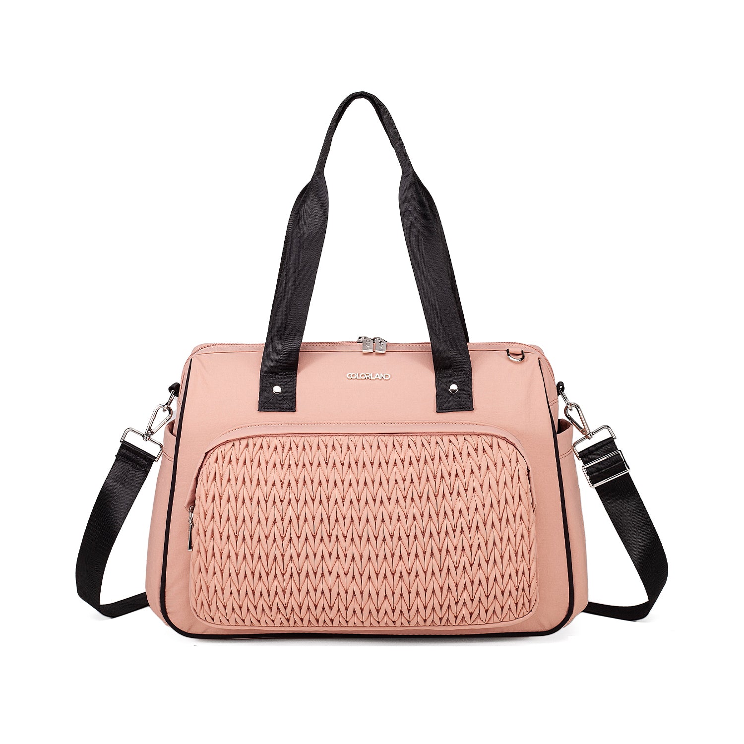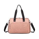 The Colorland Quilted Weekend, Gym or Diaper Bag blends chic design with practical comfort—made of 100% lightweight nylon in classic black or soft beige/pink tones. Perfect for holidays or daily outings, it features a standout quilted pattern, spacious compartments, and adaptable carry options for stylish parents on the move.