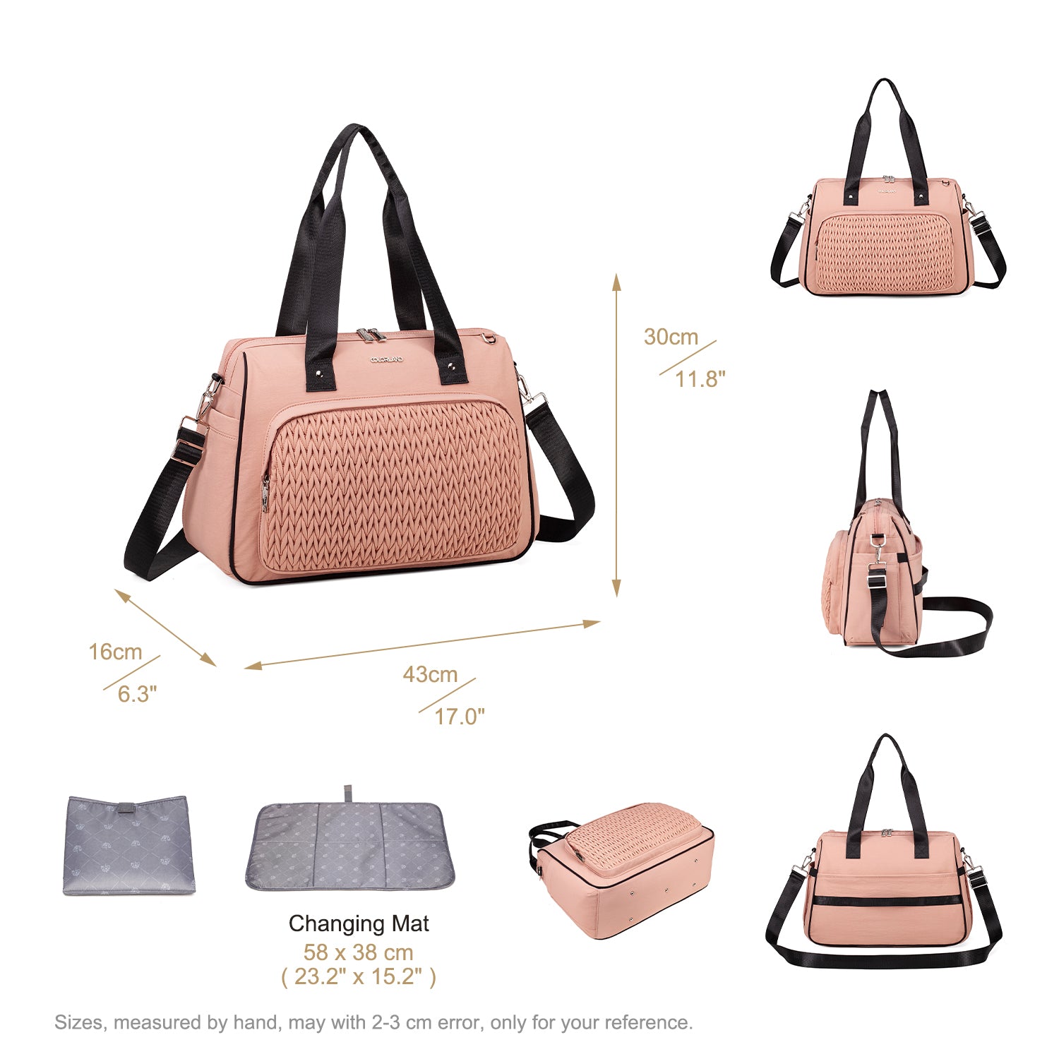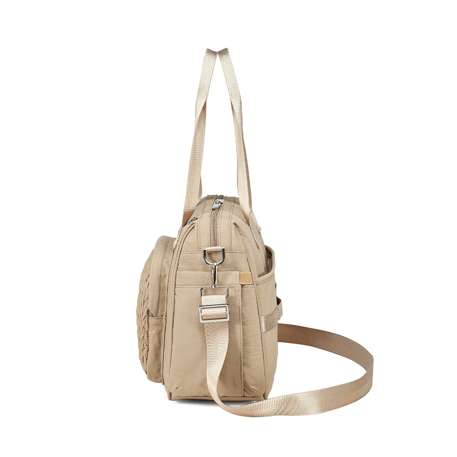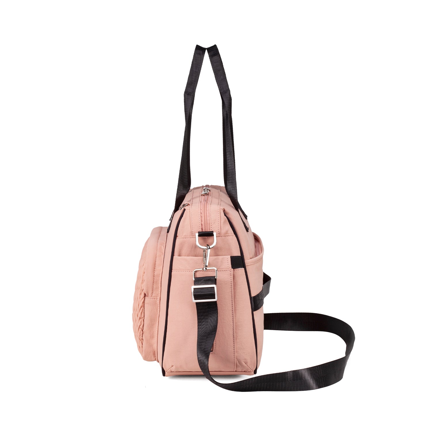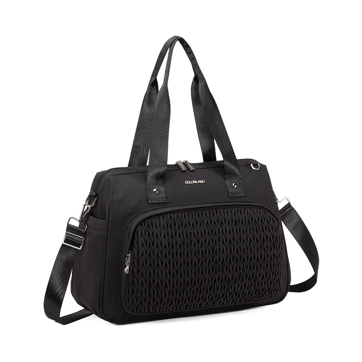 The Colorland Quilted Weekend, Gym or Diaper Bag blends chic design with practical comfort—made of 100% lightweight nylon in classic black or soft beige/pink tones. Perfect for holidays or daily outings, it features a standout quilted pattern, spacious compartments, and adaptable carry options for stylish parents on the move.